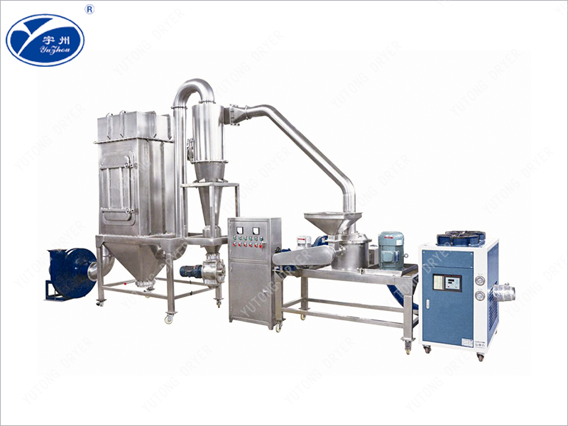 The material enters the crushing chamber through a hopper and a screw conveyor. The crushed material is sheared by high-speed blades to obtain pulverization. The material is then transported into a cyclone separator, bag filter, and discharged to meet the requirements of the product through negative pressure air transportation.