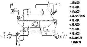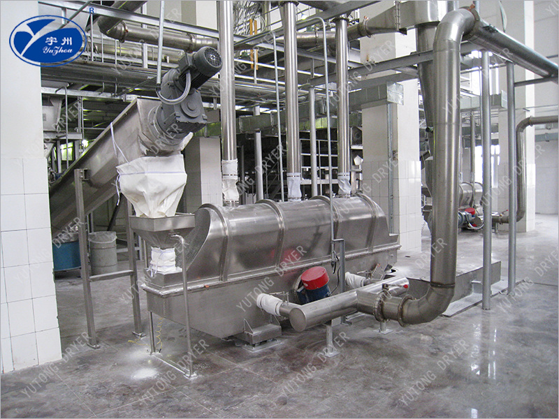The material enters the machine from the feed port. Under the action of vibration force, the material is thrown along the horizontal fluidized bed and moves forward continuously. After the hot air passes through the fluidized bed upward to exchange heat with the wet material, the wet air is removed by the cyclone separator and discharged by the exhaust outlet. The dry material is discharged through the discharge port.