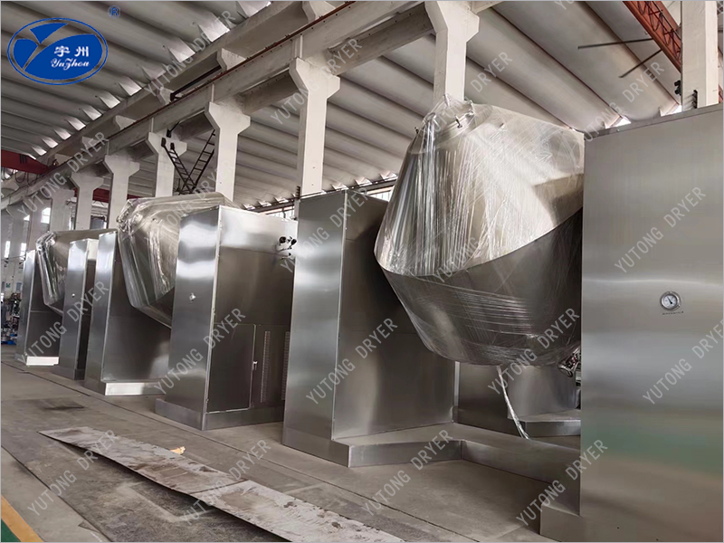SZG系列雙錐回轉(zhuǎn)真空干燥機為雙錐形的回轉(zhuǎn)罐體,罐內(nèi)在真空狀態(tài)下,向夾套內(nèi)通入蒸汽或熱水進行加熱,熱量通過罐體內(nèi)壁與濕物料接觸。濕物料吸熱后蒸發(fā)的水汽,通過真空泵經(jīng)真空排氣管被抽走。由于罐體內(nèi)處于真空狀態(tài),且罐體的回轉(zhuǎn)使物料不斷的上下,內(nèi)外翻動,故加快了物料的干燥速度,提高干燥效率,達到均勻干燥的目的。