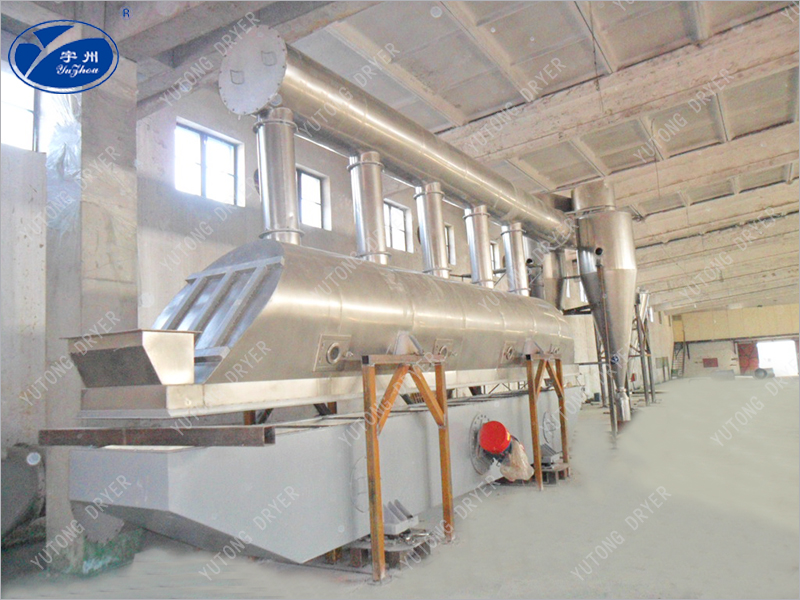 物料自進料口進入機內,在振動電機或其他方式提供的激振力作用下,在空氣分布板上跳躍前進,同時空氣經過濾后,被加熱到一定溫度,由風口進入干燥機下風室中,物料在振動力和經空氣分布板均風的熱氣流雙重作用下,呈懸浮狀態(tài)與熱氣流接觸,物料顆粒與熱介質之間進行著激烈的湍動,使傳熱和傳質過程得以強化,干燥后的產品由排料口排出,蒸發(fā)出的水份和廢氣經旋風分離器回收粉塵后,排入大氣。下床體為床層提供了一個穩(wěn)定的具有一定壓力的風室。調節(jié)引風機,使上箱體中床層物料上部保持微負壓,維持良好干燥環(huán)境并防止粉塵外泄。