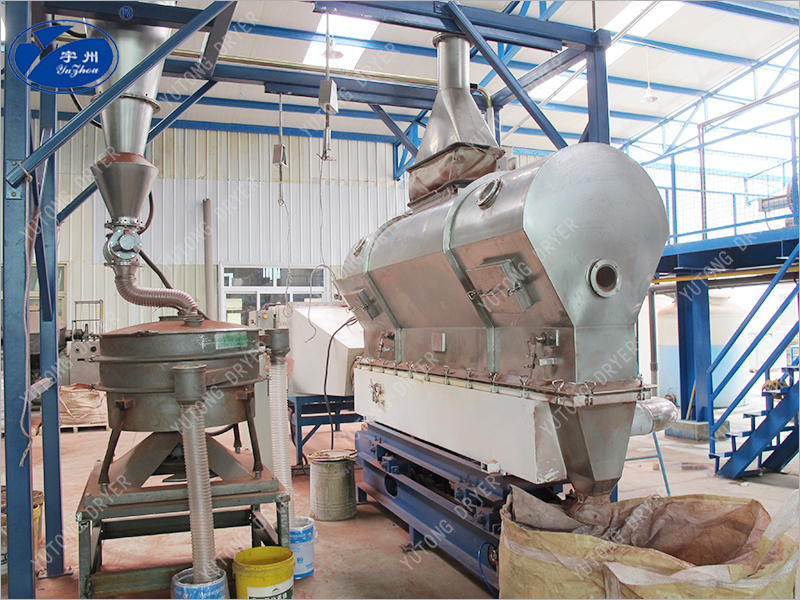 物料自進(jìn)料口進(jìn)入機(jī)內(nèi),在振動(dòng)電機(jī)或其他方式提供的激振力作用下,在空氣分布板上跳躍前進(jìn),同時(shí)空氣經(jīng)過濾后,被加熱到一定溫度,由風(fēng)口進(jìn)入干燥機(jī)下風(fēng)室中,物料在振動(dòng)力和經(jīng)空氣分布板均風(fēng)的熱氣流雙重作用下,呈懸浮狀態(tài)與熱氣流接觸,物料顆粒與熱介質(zhì)之間進(jìn)行著激烈的湍動(dòng),使傳熱和傳質(zhì)過程得以強(qiáng)化,干燥后的產(chǎn)品由排料口排出,蒸發(fā)出的水份和廢氣經(jīng)旋風(fēng)分離器回收粉塵后,排入大氣。下床體為床層提供了一個(gè)穩(wěn)定的具有一定壓力的風(fēng)室。調(diào)節(jié)引風(fēng)機(jī),使上箱體中床層物料上部保持微負(fù)壓,維持良好干燥環(huán)境并防止粉塵外泄。