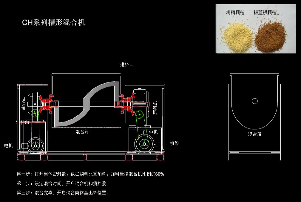 用于混合粉狀或濕性物料,使不同比例主輔料混合均勻。