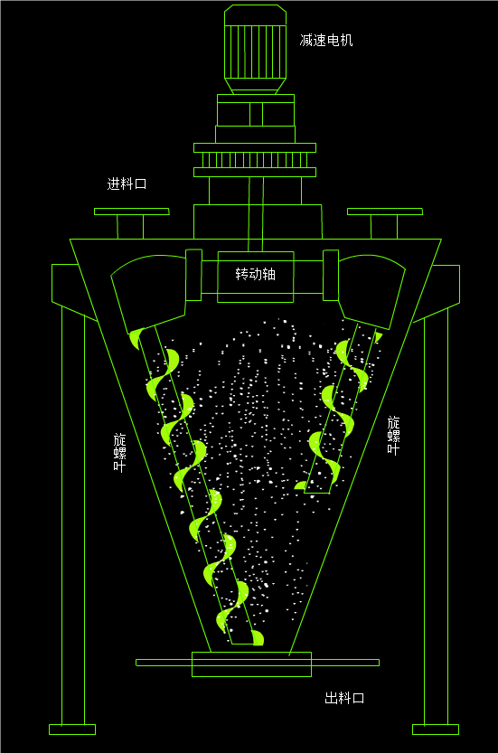 1. 螺旋沿壁公轉,使物料沿錐壁作圓周運動;