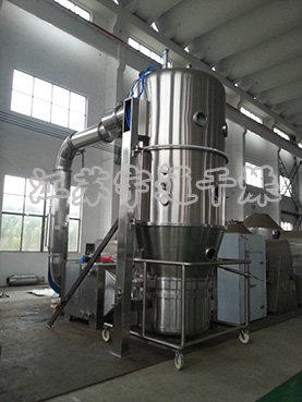 FL型沸騰制粒干燥機:物料粉末粒子,在原料容器(流化床)中呈環形流化狀態。受到經過凈化后的加熱空氣預熱和混合,將粘合劑溶液霧化噴入,使若干粒子聚集成含有粘合劑的團粒,由于熱空氣對物料的不斷干燥,使團粒中的水分蒸發,粘合劑凝固,此過程不斷重復進行,形成理想的、均勻的多微孔球狀顆粒。
