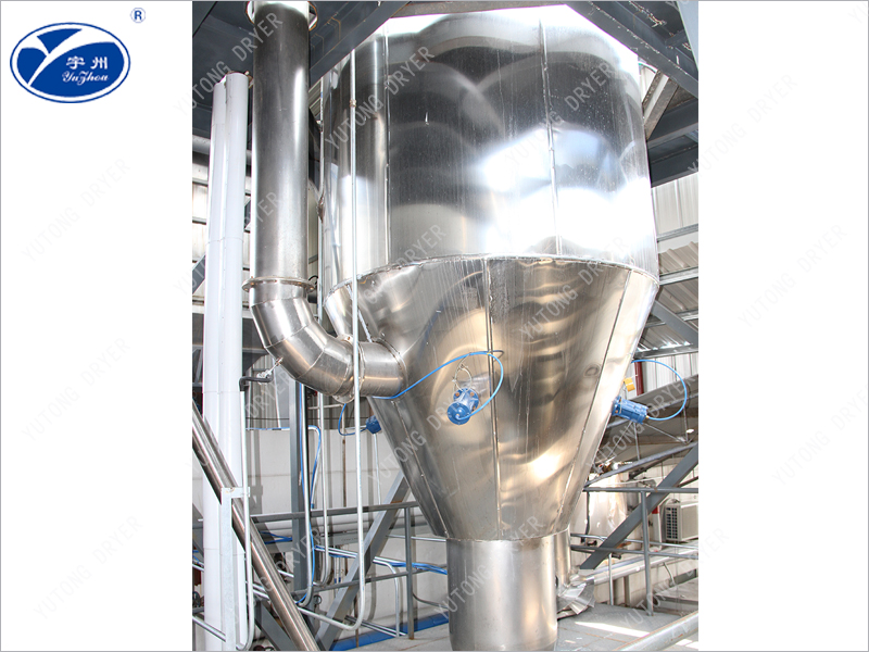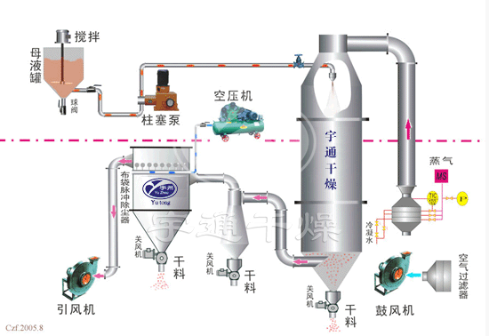 空氣通過濾清器進入加熱器,交換成熱空氣,進去干燥室頂部的熱空氣分配器,使空氣均勻呈旋轉狀或平行軸線進入干燥室。料液需經過篩后由高壓泵送至設在干燥室頂中心的噴嘴,將料液均勻的霧化,使液滴的表面積大大增加,與熱空氣相遇接觸,使水份迅速蒸發,在極短的時間里干燥成為顆粒產品,大部分產品由設在塔底部出料口收集,廢氣和微小粉粒經旋 風分離器分離,成品由旋風分離器下端收集筒收集,廢氣由抽風機排出。