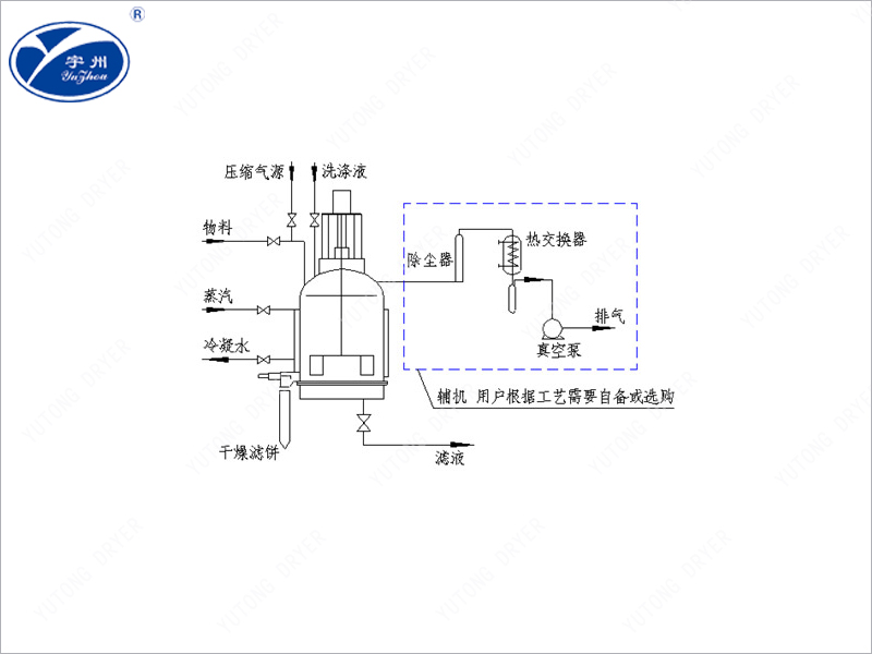 (3)吹干:充分洗滌結束后,通入壓縮空氣,對濾餅進行吹干。需要干燥的物料,通入蒸汽或熱空氣(氮氣),在真空作用下,使物料干燥。