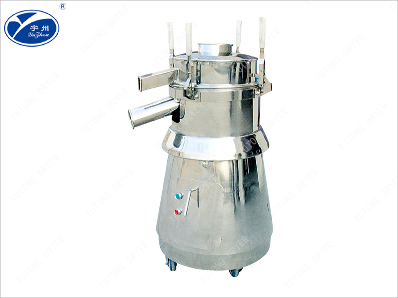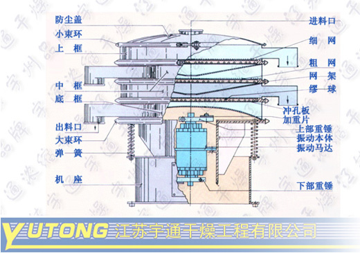 本機(jī)由料斗、振蕩室、聯(lián)軸器、電機(jī)組成。振蕩室內(nèi)有偏心輪、橡膠軟墊、主軸、軸承等組成,可調(diào)節(jié)的偏心重錘經(jīng)馬達(dá)驅(qū)動(dòng)傳達(dá)到主軸中心線,在不平衡狀態(tài)下產(chǎn)生離心力,使物料強(qiáng)度改變?cè)诤Y內(nèi)形成軌道旋渦。重錘調(diào)節(jié)器的振幅大小可根據(jù)不同物料和篩網(wǎng)進(jìn)行調(diào)整。
